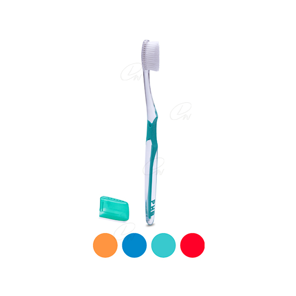 Cepillo dental con filamentos ligeramente rígidos, cabezal de pequeño tamaño y mayor número de penachos.